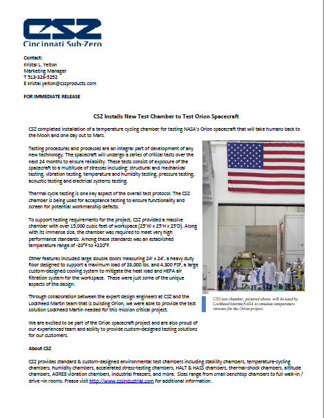 CSZ completed installation of a temperature cycling chamber for testing NASA’s Orion spacecraft that will take humans back to the Moon and one day out to Mars.