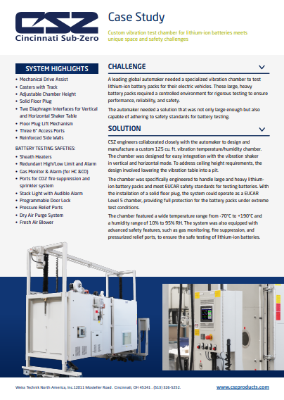 A leading global automaker needed a specialized vibration chamber to test lithium-ion battery packs for their electric vehicles. These large, heavy battery packs required a controlled environment for rigorous testing to ensure performance, reliability, and safety.